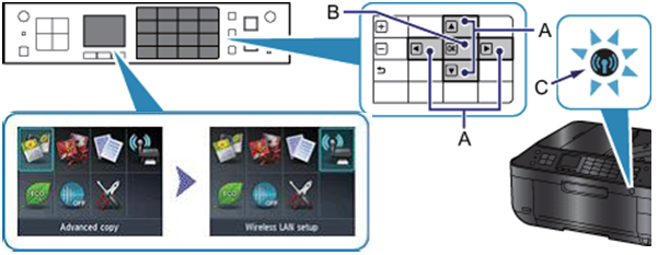 1. Use the [ ] buttons (A) to navigate to the [Wireless LAN Setup] or [WLAN Setup] icon and press the [OK] button (B).