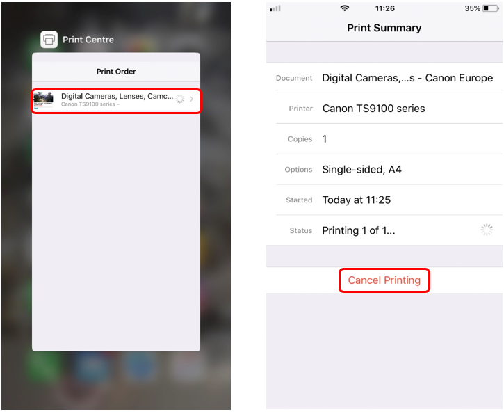During printing the [Print Centre] icon is displayed in the list of recently used apps, which can be used to check the print progress.