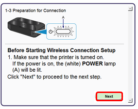 7. When the following screen appears, hold down the [Wi-Fi] button (A) on the printer until the white power lamp flashes 2 times, then release after the second flash and click on [Next].