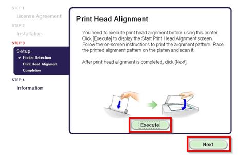 - If this is the first time you are setting up your printer, when the following screen is displayed, click on [Execute] and follow the on-screen instructions to perform the print head alignment, otherwise click on [Next].