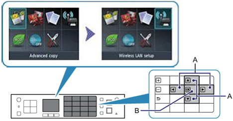 1. Use the [ ] buttons (A) to navigate to the [Wireless LAN Setup] or [WLAN Setup] icon and press the [OK] button (B).